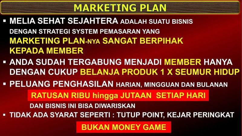 Sistem Marketing Plan PT Melia Sehat Sejahtera telah terbukti dan teruji selama lebih dari 18 tahun dengan System Marketing Plan dua group yang terlama di Asia dan no. 2 terlama