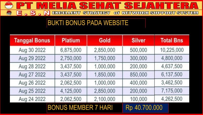 7. PT. Melia Sehat Sejahtera memiliki Support System Exellent Strategy of Network (ESN) sebagai bahan duplikasi Pembelajaran membangun jaringan, Pengembangan Diri, Pengembangan Kepemimpinan serta pengembangan karakter dan kemandirian ekonomi.