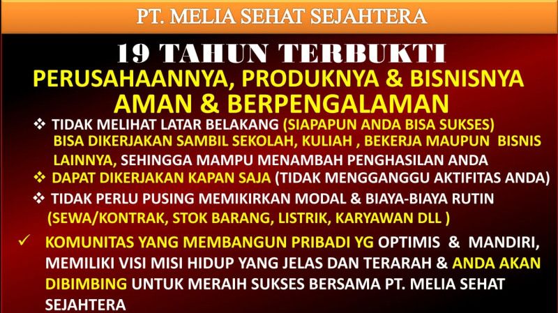 2. PT. Melia Sehat Sejahtera telah berdiri dan eksis lebih dari 18 tahun di Indonesia untuk melayani seluruh Leader dan member dengan management yang profesional dan memiliki komitmen total untuk membantu para member nya berkembang dan bertumbuh
