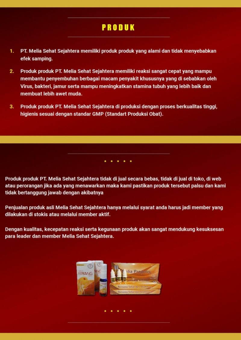 • Produk produk PT. Melia Sehat Sejahtera tidak di jual secara bebas, tidak di jual di toko, di web atau perorangan. Jika ada yang menawarkan maka kami pastikan produk tersebut palsu dan kami tidak bertanggung jawab dengan akibatnya.