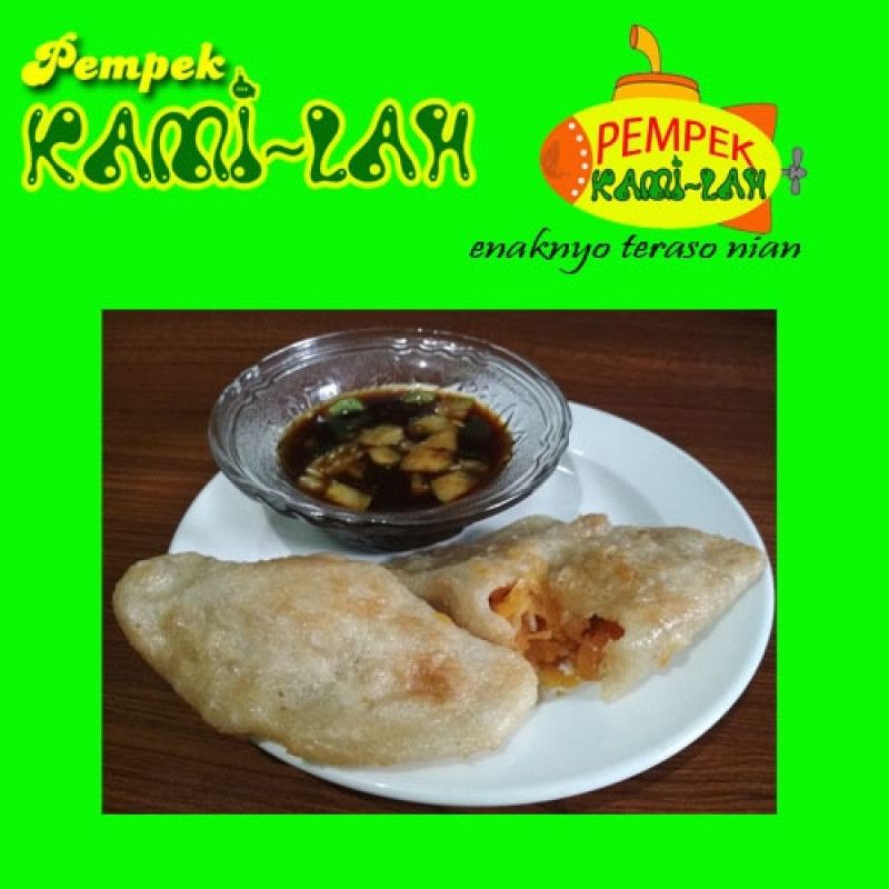 1 Pcs Pempek Kulit Ikan dari Pempek Kami-Lah dibuat dari kulit ikan tenggiri dicampur sedikit daging ikan giling, dicampur tepung sagu berkualitas tinggi, telur, bawang putih serta garam disajikan dengan cuko kental khas resep unik dari Pempek Kami-Lah