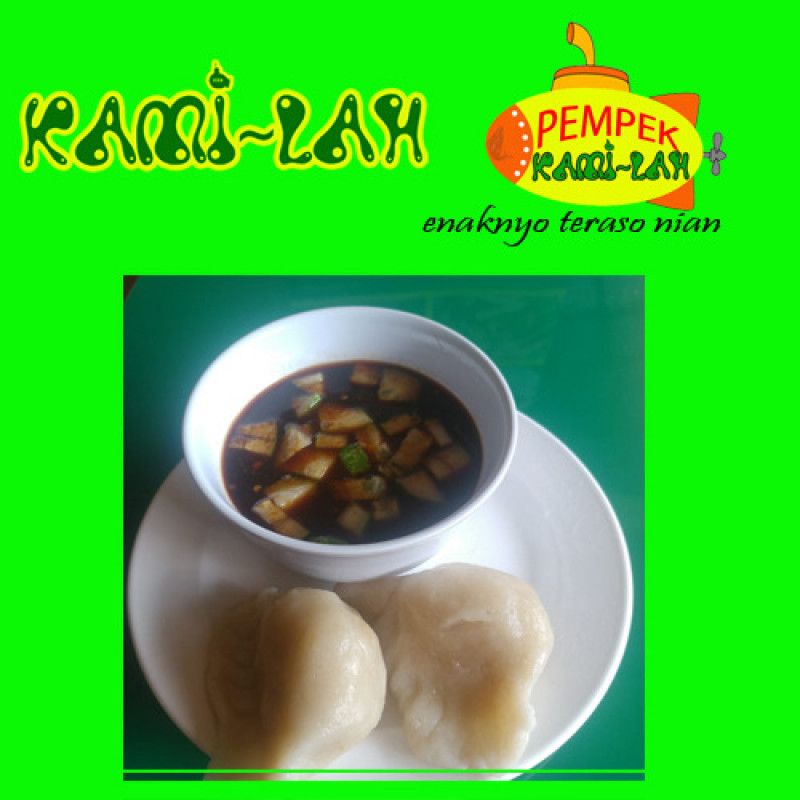 1 Pcs Pempek Belah dari Pempek Kami-Lah dibuat dari sedikit ebi dan udang rebon halus, dicampur tepung sagu berkualitas tinggi, telur, bawang putih serta garam diisi bumbu kental khas dari Pempek Kami-Lah