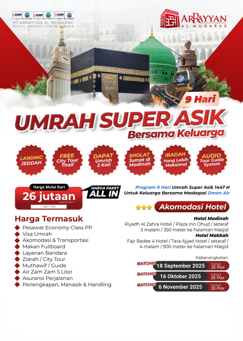 Penyelenggara Umrah dan Haji Resmi Terdaftar di Kemenag RI dengan Ijin PPIU No. 508 Tahun 2021 dan Ijin PIHK No. 303 Tahun 2022 serta terakreditasi "A" oleh Lembaga Akreditasi Nasional.