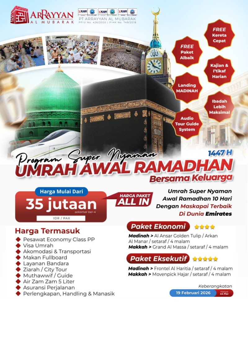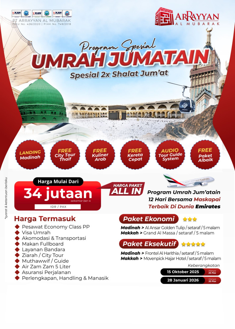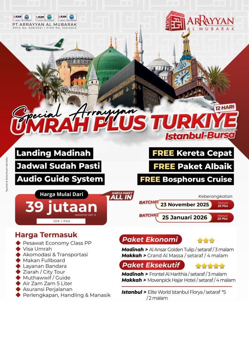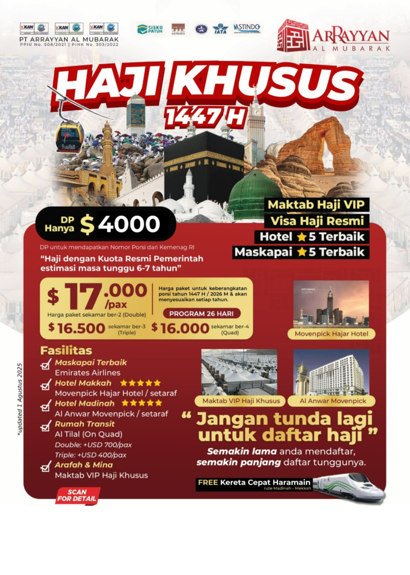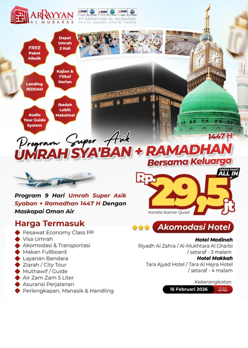 Penyelenggara Umrah dan Haji Resmi Terdaftar di Kemenag RI dengan Ijin PPIU No. 508 Tahun 2021 dan Ijin PIHK No. 303 Tahun 2022 serta terakreditasi "A" oleh Lembaga Akreditasi Nasional.