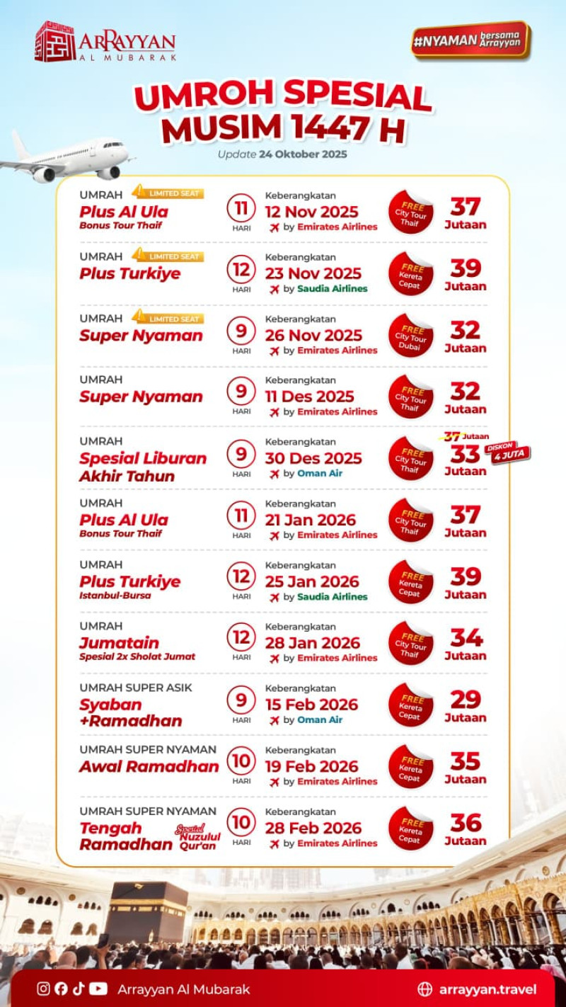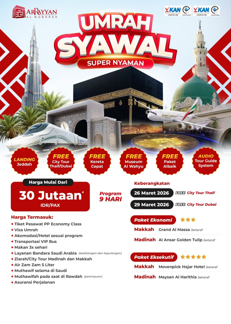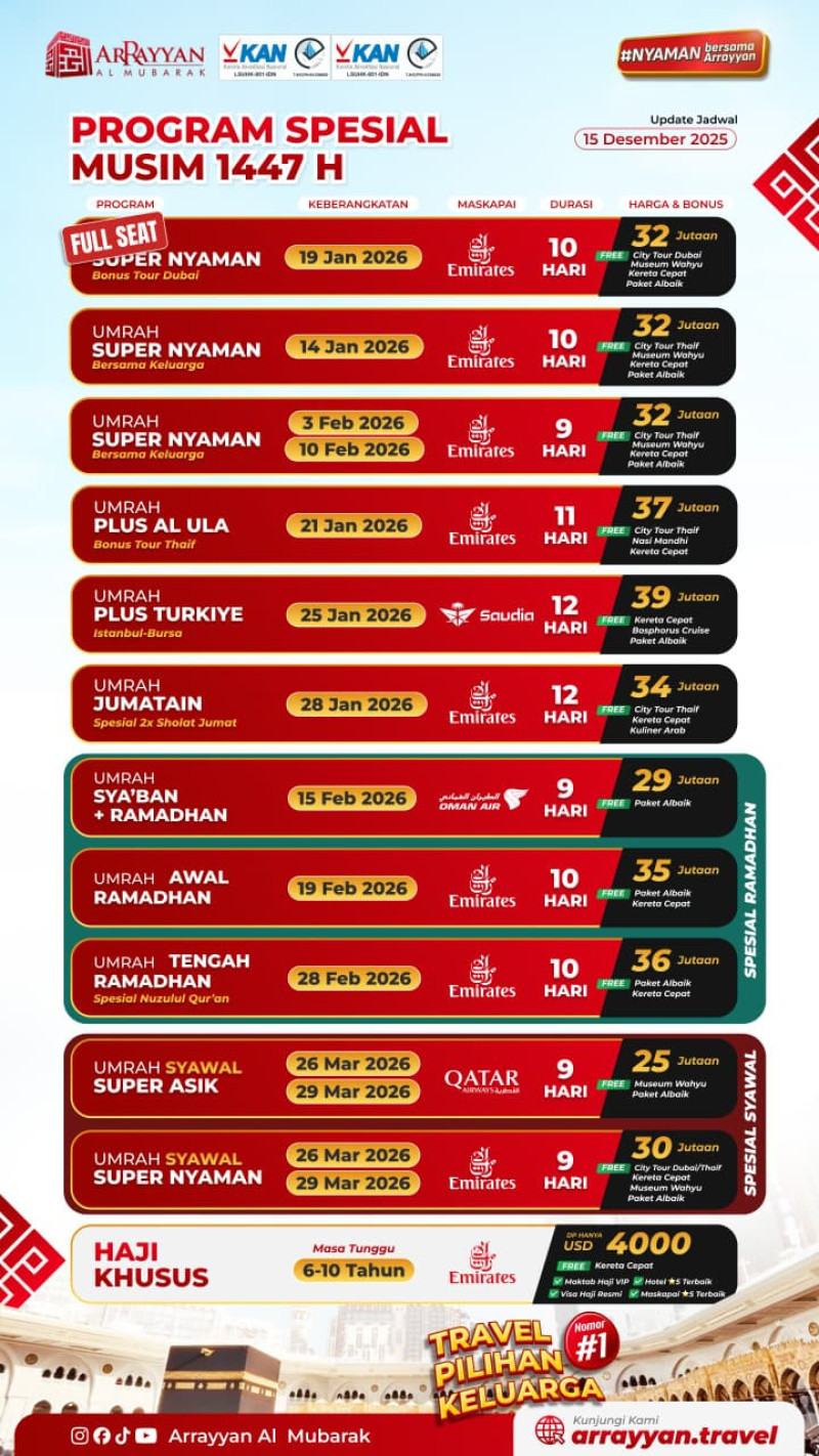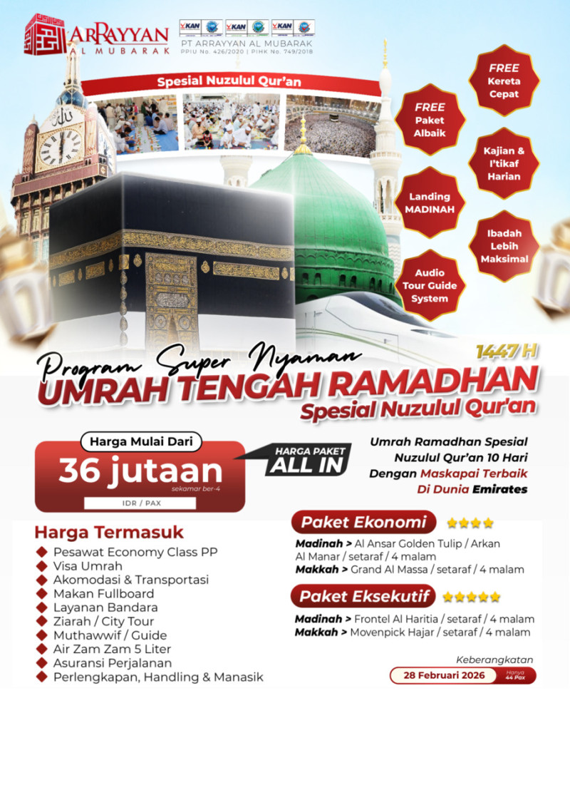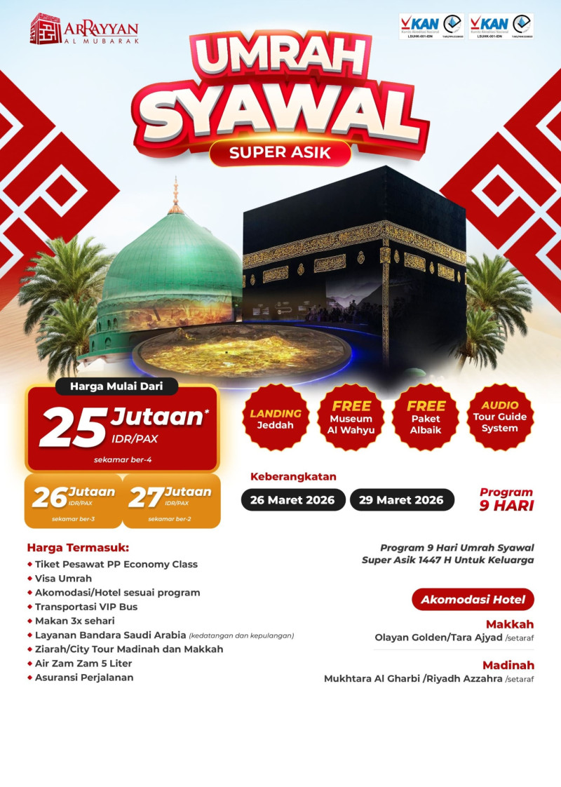 Penyelenggara Umrah dan Haji Resmi Terdaftar di Kemenag RI dengan Ijin PPIU No. 508 Tahun 2021 dan Ijin PIHK No. 303 Tahun 2022 serta terakreditasi "A" oleh Lembaga Akreditasi Nasional.