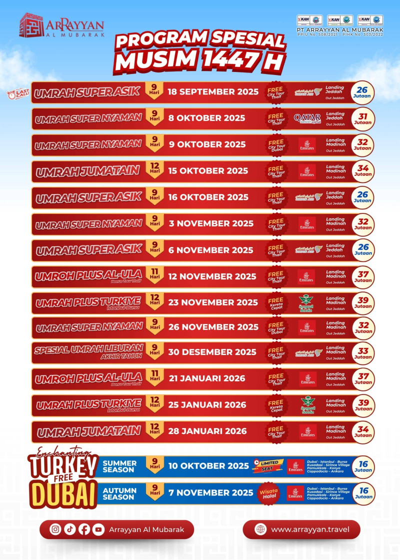 Penyelenggara Umrah dan Haji Resmi Terdaftar di Kemenag RI dengan Ijin PPIU No. 508 Tahun 2021 dan Ijin PIHK No. 303 Tahun 2022 serta terakreditasi "A" oleh Lembaga Akreditasi Nasional.