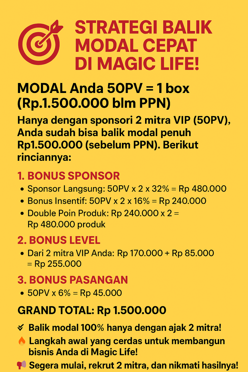 Karena MAGIC LIFE Hadir Dengan Marketing Plan Simpel, Mudah Di DUPLIKASI, Memberikan Keuntungan Semua Pihak, Pembayaran Setiap Hari dan Potensi Income UNLIMITED